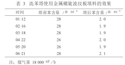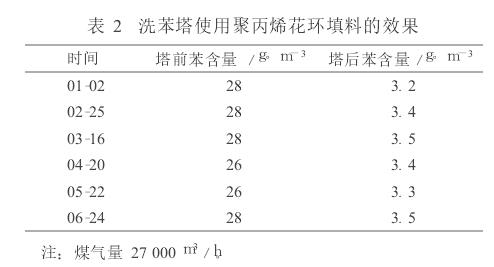 洗苯效果的好壞,關(guān)鍵取決于洗苯塔的結(jié)構(gòu)和塔內(nèi)填料,因此選用合適的填料可以提高煤氣中粗苯的回收率,降低生產(chǎn)成本,保證裝置長(zhǎng)周期運(yùn)行。